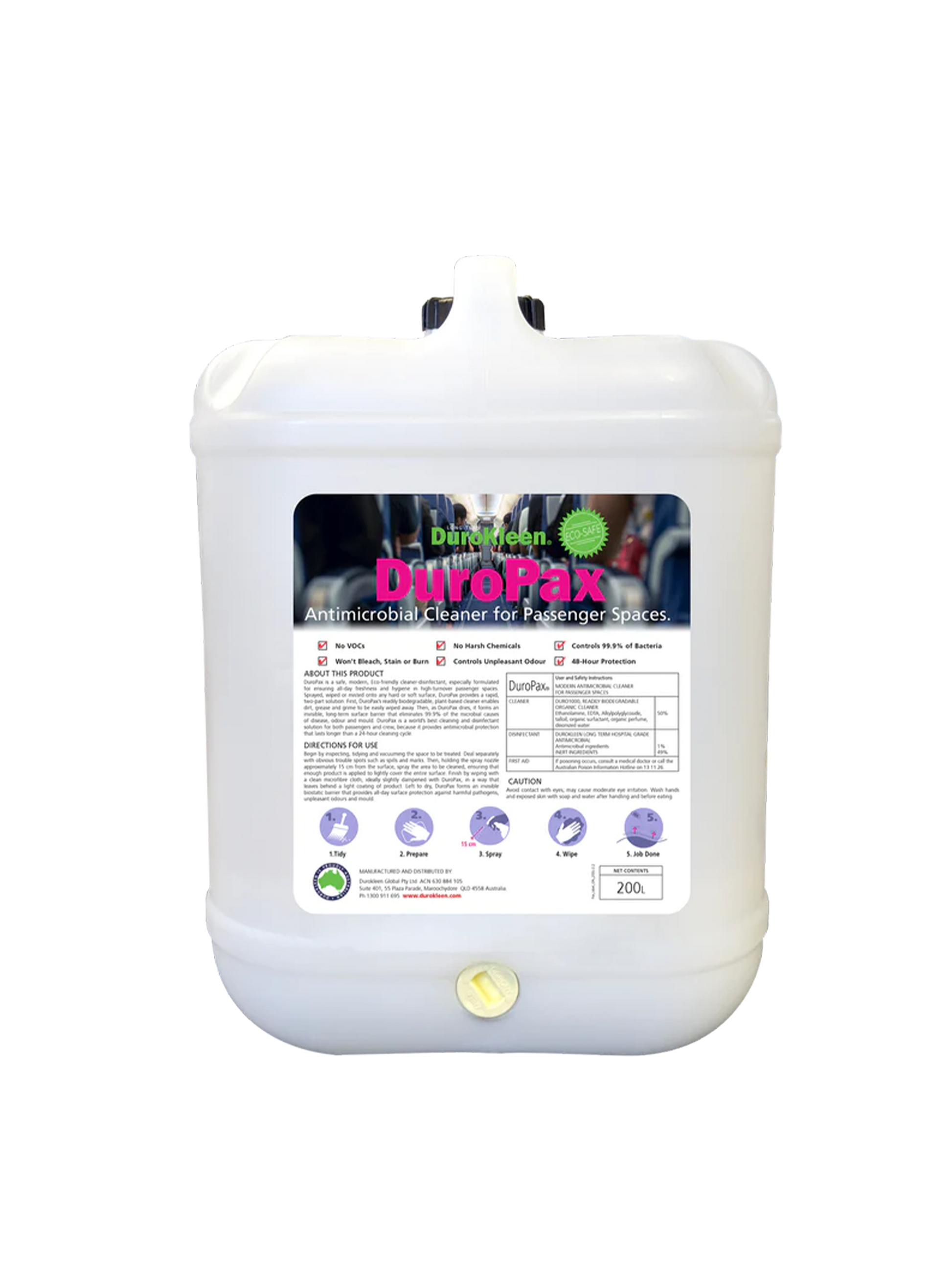 DuroPax is a very safe and effective surface cleaner and hospital grade disinfectant. Containing a unique blend of plant based ingredients DuroPax will effectively remove dirt from a surface while the DuroKleen technology it contains creates a microscopic biostatic barrier that disinfects the surface leaving it cleaner for longer.